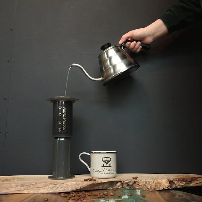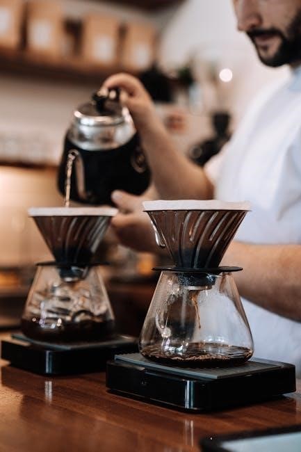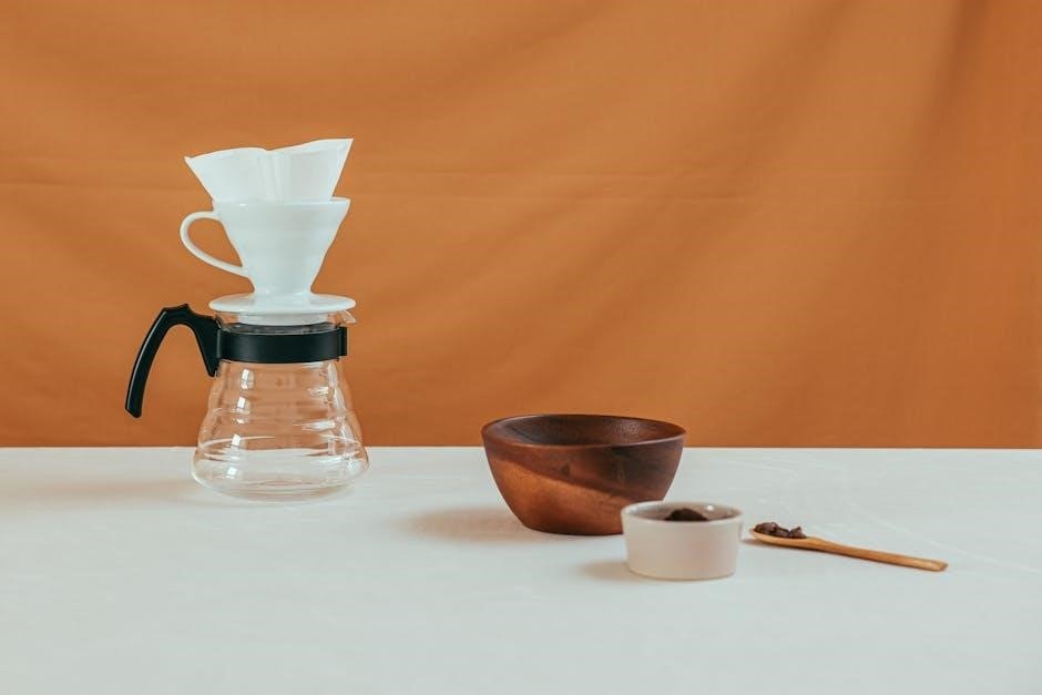 To brew coffee with the Drew Barrymore Coffee Maker, start by plugging in the machine and ensuring it is preheated. Measure one tablespoon of coffee for every six ounces of water. Place a paper filter in the machine’s filter basket and add the ground coffee. Pour fresh, filtered water into the water reservoir, aligning with the desired brew size. Select the “Brew” option on the interface and wait for the cycle to complete. The machine will automatically drip the coffee into the thermal carafe; Once done, remove the carafe and pour your coffee. For optimal flavor, use filtered water and medium-coarse ground coffee. Adjust the coffee-to-water ratio to your preference for a perfect cup every time.