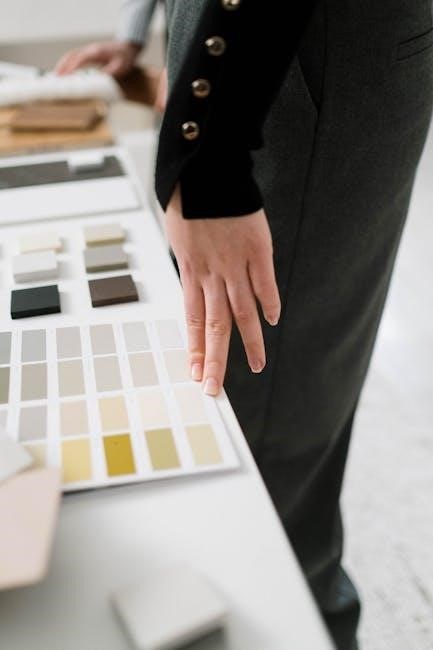 Coordinating colors for harmonious spaces involves creating a balanced and visually appealing environment. The Formica Color Chart PDF simplifies this process by offering a curated selection of colors that work well together. Start by selecting a dominant color, such as Carnaval or Olympia, and use the chart to identify complementary shades like Heather or Azur. Neutral tones, such as Almond Blossom, can serve as a base, while bold colors like Thistle add accents. Consider the room’s purpose and lighting to ensure a cohesive look. By aligning colors with the space’s function and ambiance, you can achieve a harmonious design that enhances functionality and aesthetics.